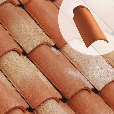 Demi-tuile à emboîtement grand moule faiblement galbée à relief en terre cuite.