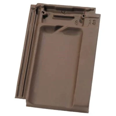 Tuile en terre cuite, à petit moule et à côte latérale à double emboîtement et double recouvrement. Elle se pose à joints droits.