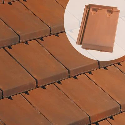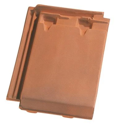 Tuile, en terre cuite à petit moule à double emboîtement à pureau plat. Se pose à joints croisés.