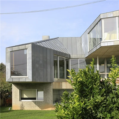 - La patine naturelle (gris clair semi-mat) apparaît entre six mois et deux ans après la pose, selon le milieu environnant et sa localisation sur le bâtiment.
