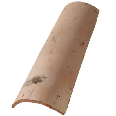 Tuile canal en terre cuite filée avec des reliefs de surface, des nez destructurés et des jeux de texture.