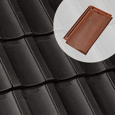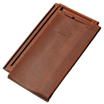 Tuile faiblement galbée, en terre cuite, aspect semi-plat. Double emboîtement et deouble recouvrement. Pose à joints droits.